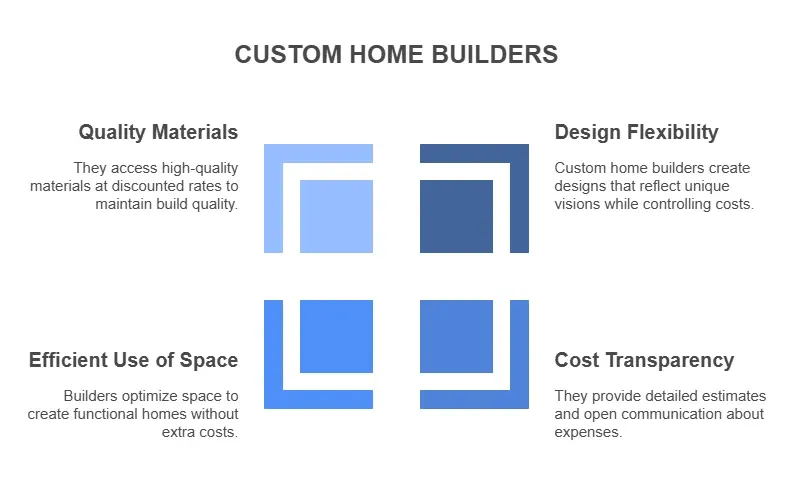 - Custom home builders maintain access to suppliers who offer at discounted rates high-quality materials. This can lower without compromising on your home’s quality the cost of your build.